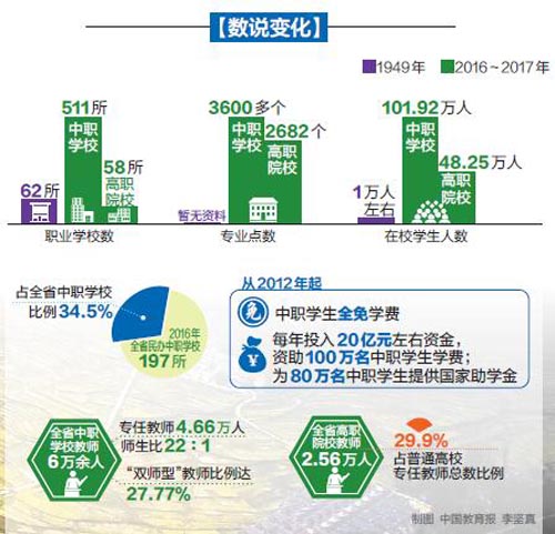 70年来,四川充分发挥职业教育在改善民生、脱贫攻坚工作中的重要作用,实现了民族地区职业教育发展从无到有,贫困地区职业教育发展提质增速,贫困地区及贫困人口的文化素养和技能水平不断提高。职业教育成为四川阻断贫困代际传递、服务精准扶贫的重要“先手棋”。