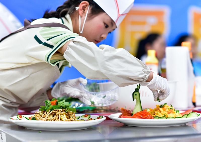4月27日,学生在贵州省龙里县中等职业学校赛场参加烹饪比赛时摆盘。