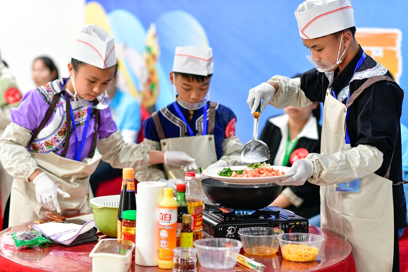 4月27日,学生在贵州省龙里县中等职业学校赛场参加烹饪比赛。