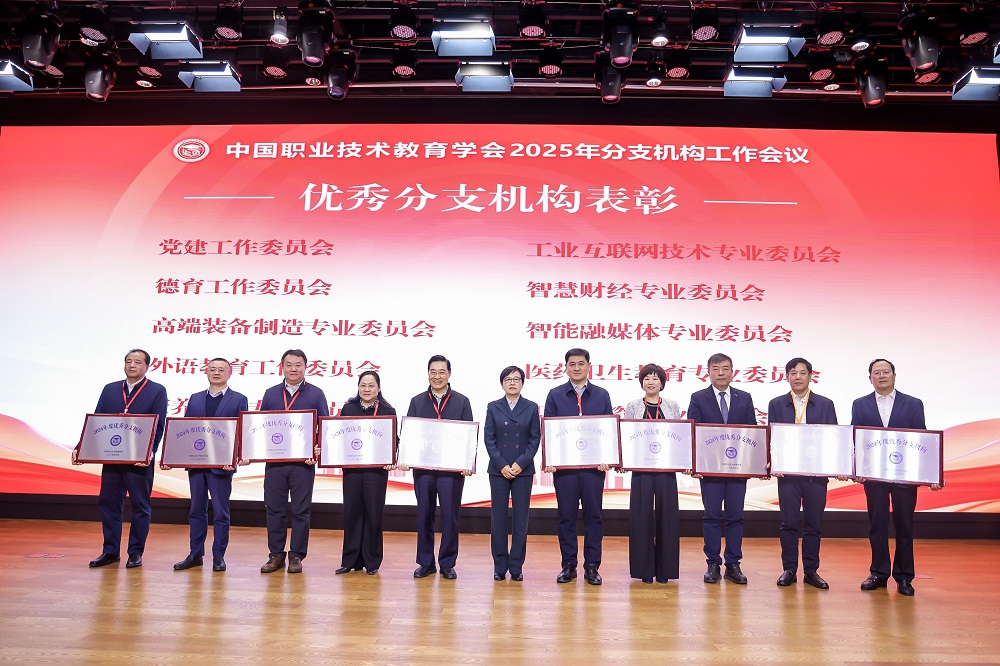 会上,学会向优秀分支机构颁牌。党建工作委员会、德育工作委员会、高端装备制造专业委员会、外语教育工作委员会、康养康育专业委员会、工业互联网技术专业委员会、智慧财经专业委员会、智能融媒体专业委员会、医药卫生教育专业委员会、职教师资专业委员会等10家优秀分支机构负责同志,围绕党建引领,落实立德树人根本任务,进一步推进产教融合、校企合作,服务现代产业体系建设等进行交流发言。