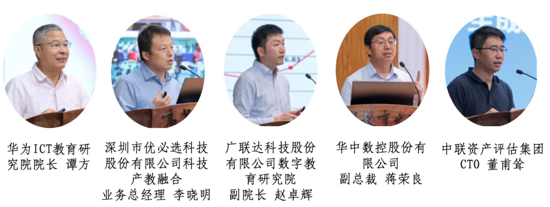 华为ICT教育研究院院长谭方、深圳市优必选科技股份有限公司科技产教融合业务总经理李晓明、广联达科技股份有限公司数字教育研究院副院长赵卓辉、华中数控股份有限公司副总裁蒋荣良、中联资产评估集团CTO董甫耸等5位头部企业代表介绍了技术供给及应用场景。