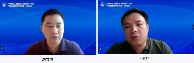 顺丰集团招聘总监周文博、新道科技股份有限公司教育服务事业部总经理何胜利作为企业代表,在“企业谈师生权益”板块作主题发言。两位企业代表深入交流了新修订的职业教育法对行业企业的启示和指引,并从校企合作模式、人才培养路径、岗位技能培训、就业质量提升等方面,分享了企业保障职业教育师生权益的经验做法。