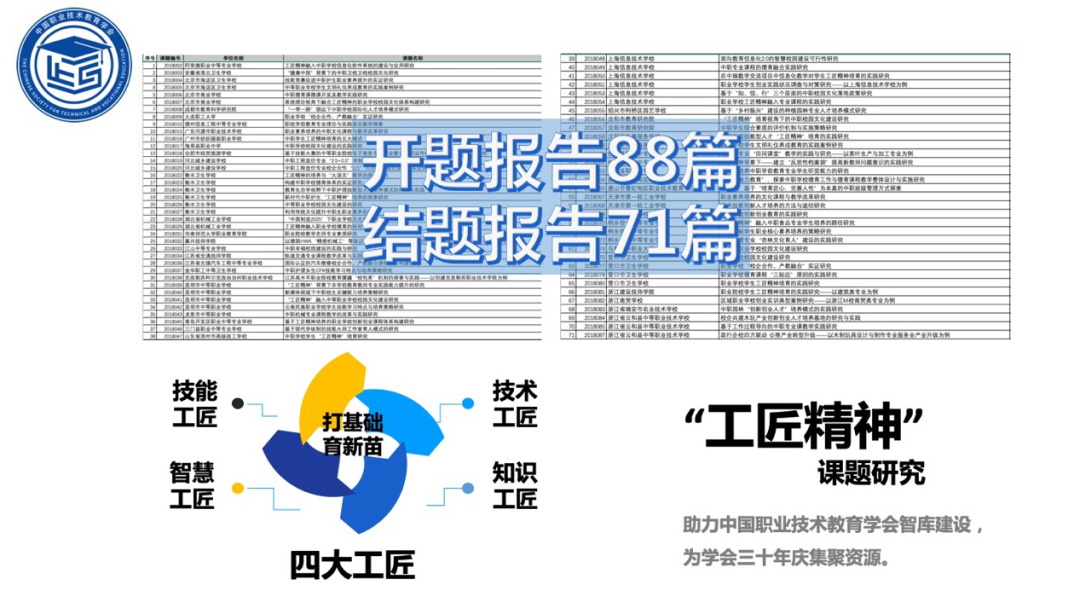 根据鲁昕会长提出的培养四级强国工匠的要求,中职分会开展了“工匠精神”课题研究工作,共收到开题报告88篇、结题报告71篇,在技能工匠、技术工匠、智慧工匠、知识工匠的培养过程中,很好地发挥了中等职业教育“打基础、育新苗”的作用,助力betway西汉姆联官网智库建设,为学会三十年庆集聚资源。